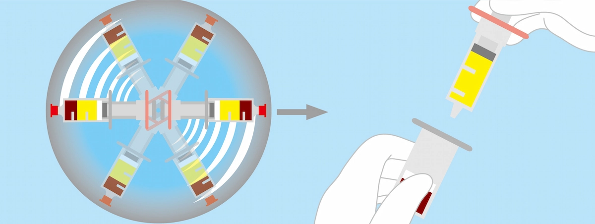 患者様の血液には成長因子等の良いタンパク質、炎症や軟骨破壊を促進する悪いタンパク質が一緒に含まれています。PRP療法では、成長因子を多く含む血小板と細胞の栄養素等を含む血漿を悪いタンパク質を含む赤血球から分離することで血液のもつ治癒作用を高めて治療に利用されます。