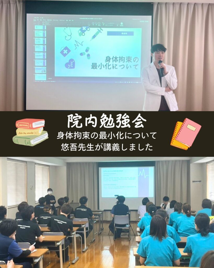 当院では毎月、医療の質を向上させるための勉強会を開催しています。今回は「身体拘束をできるだけ減らすには?」というテーマで学びを深めました。